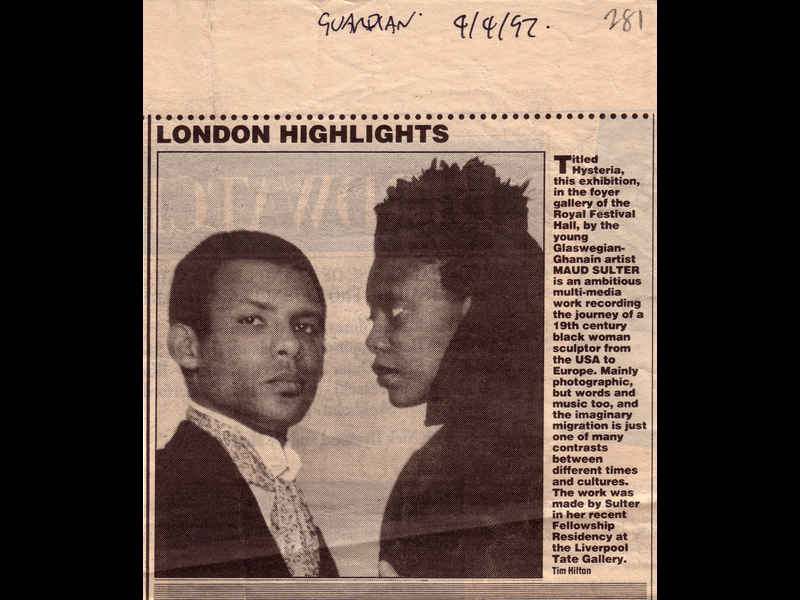 Accompanied by a photograph from the exhibition: “Titled Hysteria this exhibition, in the foyer gallery of Royal Festival Hall, by the Glaswegian Ghanian artist Maud Sulter is an ambitious multi-media work recording the journey of a 19th century black woman sculptor from the USA to Europe.”