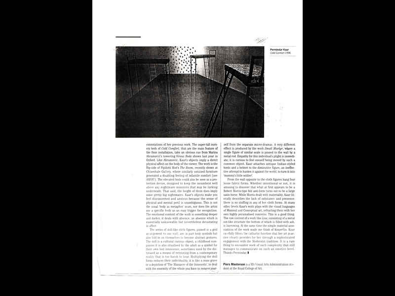 Title: Cold Comfort: Permindar Kaur. Review by Piers Masterson, Art Monthly, 1998 July-August 1996.