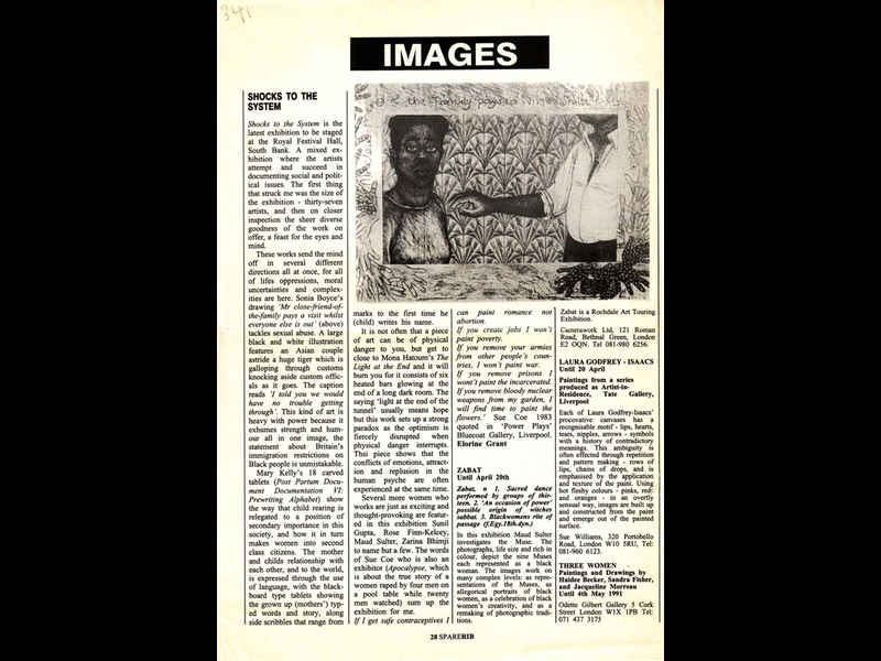 Two articles relating to exhibitions that feature Maud Sulter as well as Sonia Boyce and Sue Coe: Shocks to the System - by Elorine Grant: features a photographic reproduction of “Mr close-friend-of-the family pays a visit whilst everyone else is out“ by Sonia Boyce. Zabat - Until April 20th - at Camerawork/solo exhibition by Maud Sulter.
