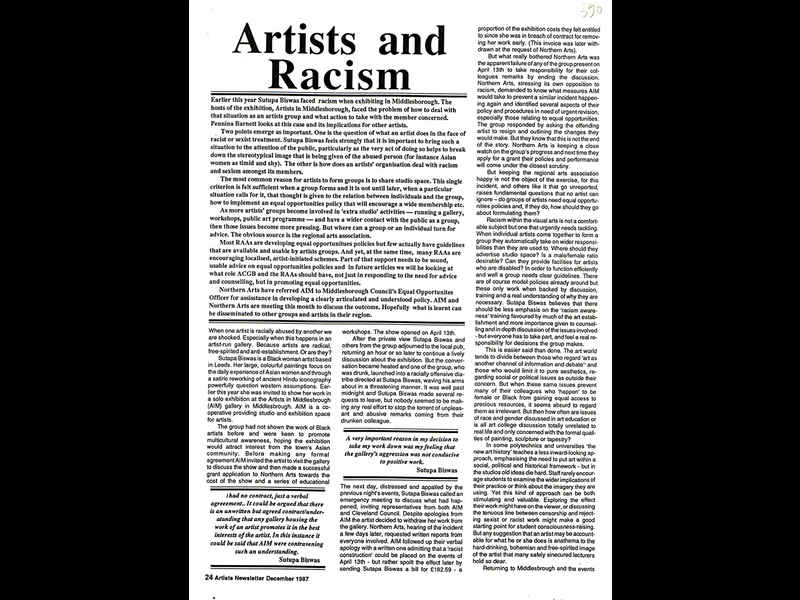“Earlier this year Sutapa Biswas faced racism when exhibiting in Middlesborough. The hosts of the exhibition, Artists in Middlesborough, faced the problem of how to deal with that situation as an artists group and what action to take the member concerned. Pennina Barnett looks at this case and its implications for other artists.”