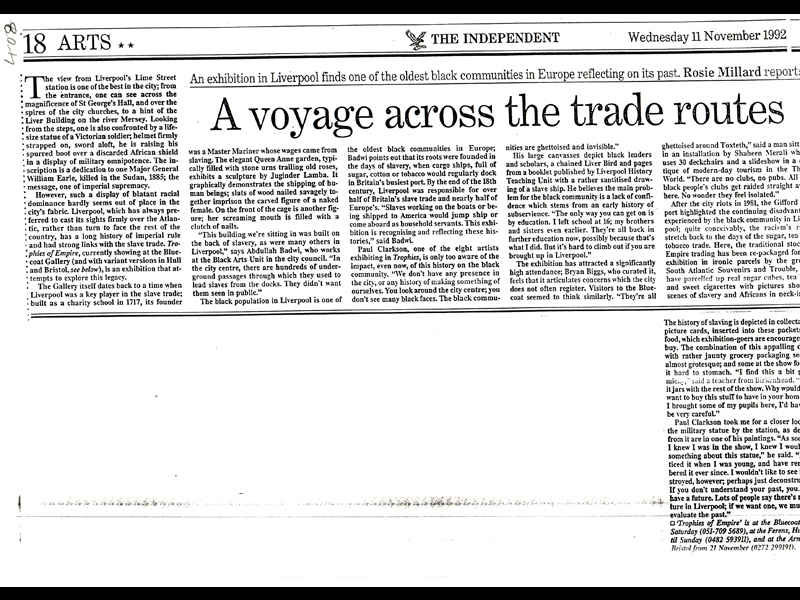 A4 landscape single sheet photocopied from original/The Independent/Wednesday 11 November 1992/page 18/Arts/Article in response to the exhibition Trophies of Empire at the Bluecoat, Liverpool