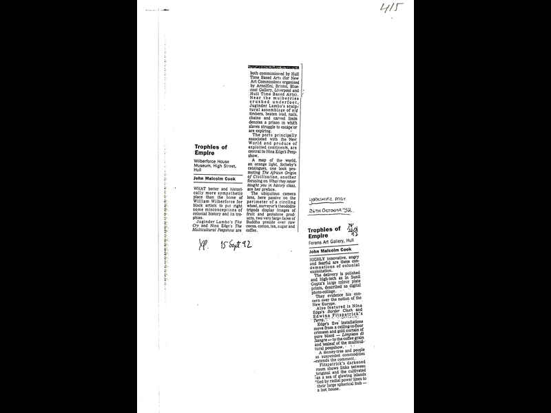 Title: Trophies of Empire - Ferens Art Gallery, Hull. XP? / 15 September 1992 / no page ref / by John Malcolm Cook