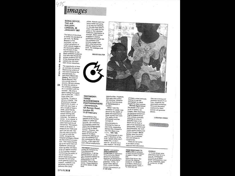 Single sheet A4 portrait/monochrome photocopy from copy/Review from Spare Rib, Culture Shock/Images section, no date, p.34/Review relating to the solo exhibition by Sonia Boyce at AIR Gallery, London