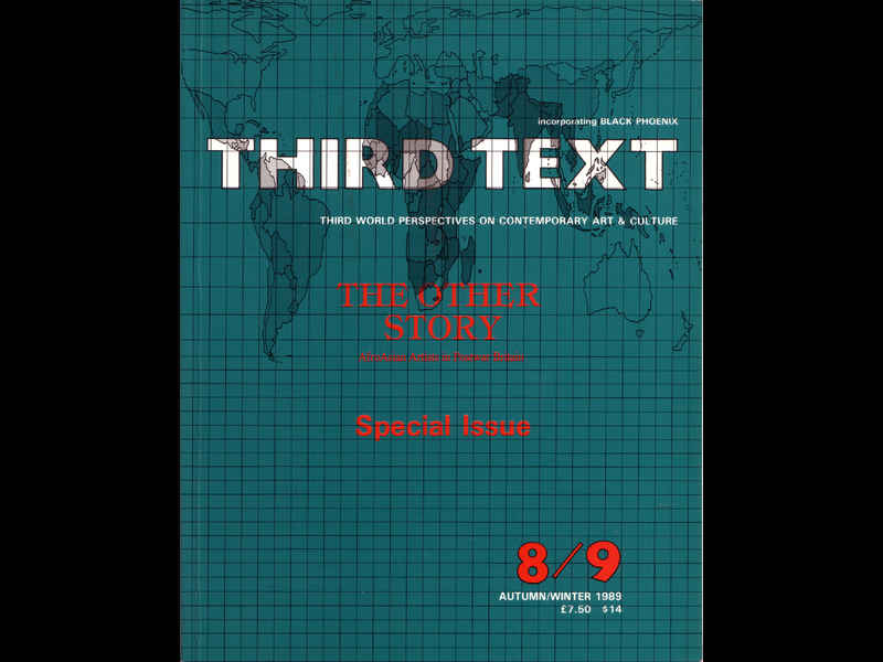 A4 sized soft cover publication/colour cover, monochrome text and images/issue 8/9 Autumn/Winter 1989, 192 pages. © 1989 Third Text. Published by Kala Press, part of the organisation Black Umbrella (financially assisted by GLA); typeset by Emset, London, NW10, and printed by Whitstable Litho, Kent.