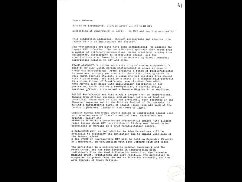 Extracts from the exhibition Press Release: “This exhibition addresses, through photographs and stories, the impact of HIV on individuals and society. Six photographic projects have been commissioned to address the impact (sic) HIV infection. The contributions approach this issue from a number of different perspectives, using practices ranging from documentary photography to constructed images. All the contributions are linked by stories expressing direct personal experiences related to HIV and AIDS. The exhibition is a collaboration between Camerawork and The Photo Co-op, and has been devised in consultation with individuals from the Health Education Authority, the Terence Higgins Trust, Frontliners and Body Positive. The exhibition is supported by grants from the Health Education Authority and the Arts Council of Great Britain.”
