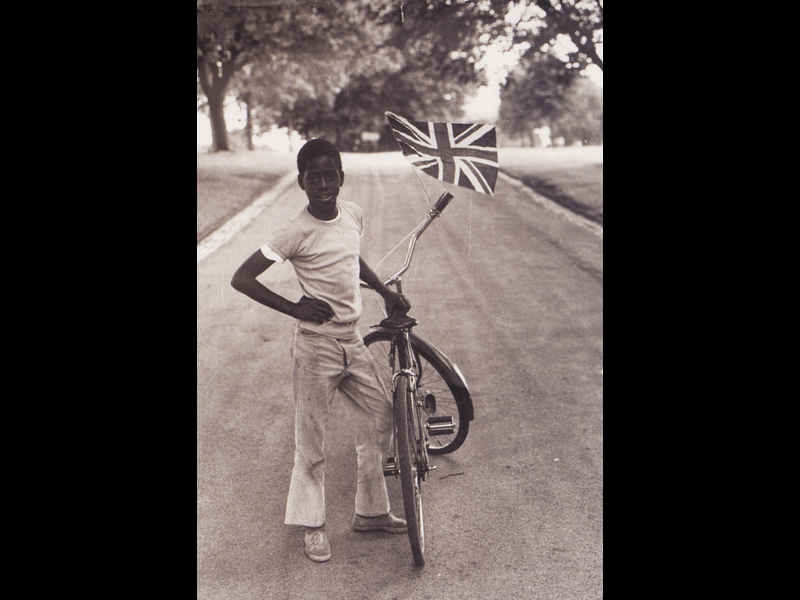 Card invitation to the Launch of a group exhibition The Meaning of Style: Black British Style, and the underlying political and social environment. New Art Exchange, 16 January - 10 April 2010. The launch took place on Friday 15 january 2010, 6 - 9 pm. The image on the card was a celebrated photograph by Vanley Burke; a youngster riding his bike in a Birmingham Park, circa mid to late 1970s. The boy’s bicycle is adorned by a British flag.